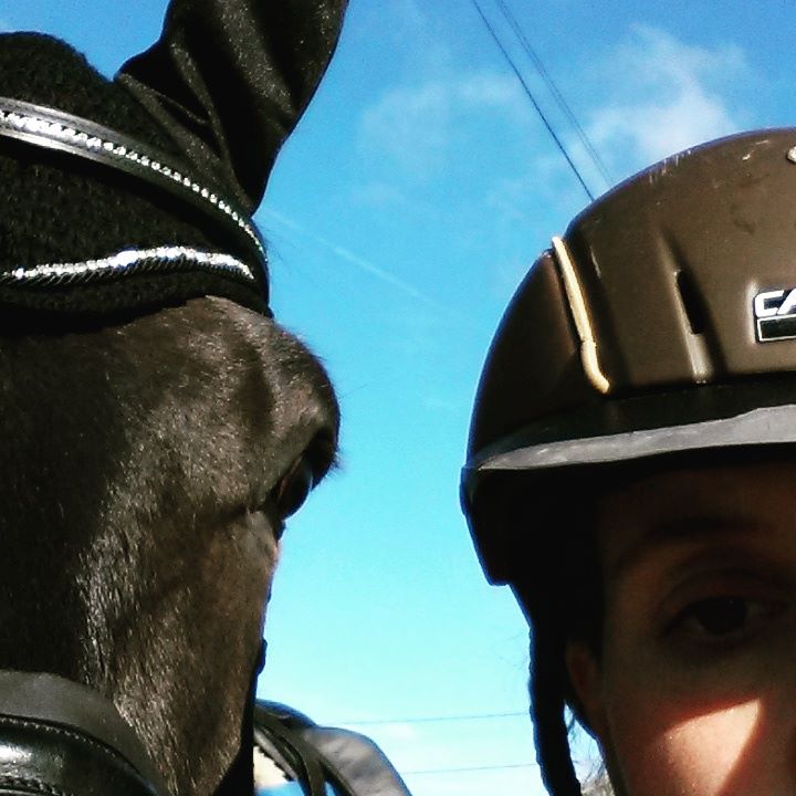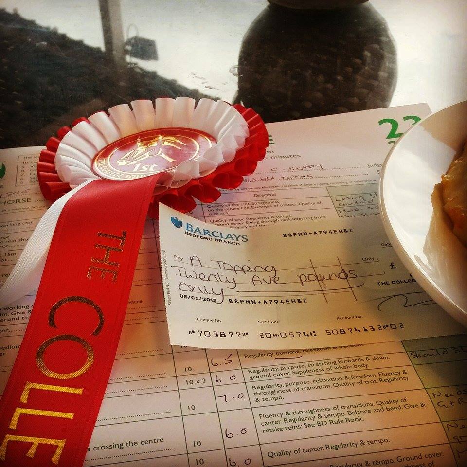 Saturday morning I got up super early & trained Hubert outside & what a difference from a few weeks ago, so much more confident again. It ended up quite a rush between his morning exercise, plaiting, mucking out & getting back on to warm him up. Keysoe had opened up one of the outdoor arenas for warm up & it helped a lot. It was the best warm up we had ever had. By the time we left the warm up it was getting busy & I was glad to start my test. A few little mistakes kept our score down, but he at least attempted to go forwards within the whiteboards & I came out of the test with a huge smile on my face – to be honest I had no idea what the judge was going to make of the test, but he had felt so much more confident than the last competition, which left me happy. The only problem we really had was getting out of the arenas – there were some white plastic garden chairs that had been moved & he was so scared of them we spun around 3 times back to the competition arena before someone walked in front of him & he followed them gingerly out. After a short break for Hubert we warmed up indoors for our second test & got called into the arena 7 minutes early (being on my own I had no way of double checking my time & waiting), so after a very short, but forward, warm up we went in the arena. He coped really well going from the indoor to the outdoor for the test & again he was a little more forward, there were a lot of mistakes in the canter work but overall the trot work was fab. After settling him back in his stable I went & checked my scores, 63.52% in the first test & 58.45% in the second, & also a 1st & 2nd placing – including prize money! I was over the moon!!! The rest of Saturday was spent watching the advanced classes, hand grazing Hubert & cleaning tack. The cafe closed early again so another night of Soreen loaf it was.